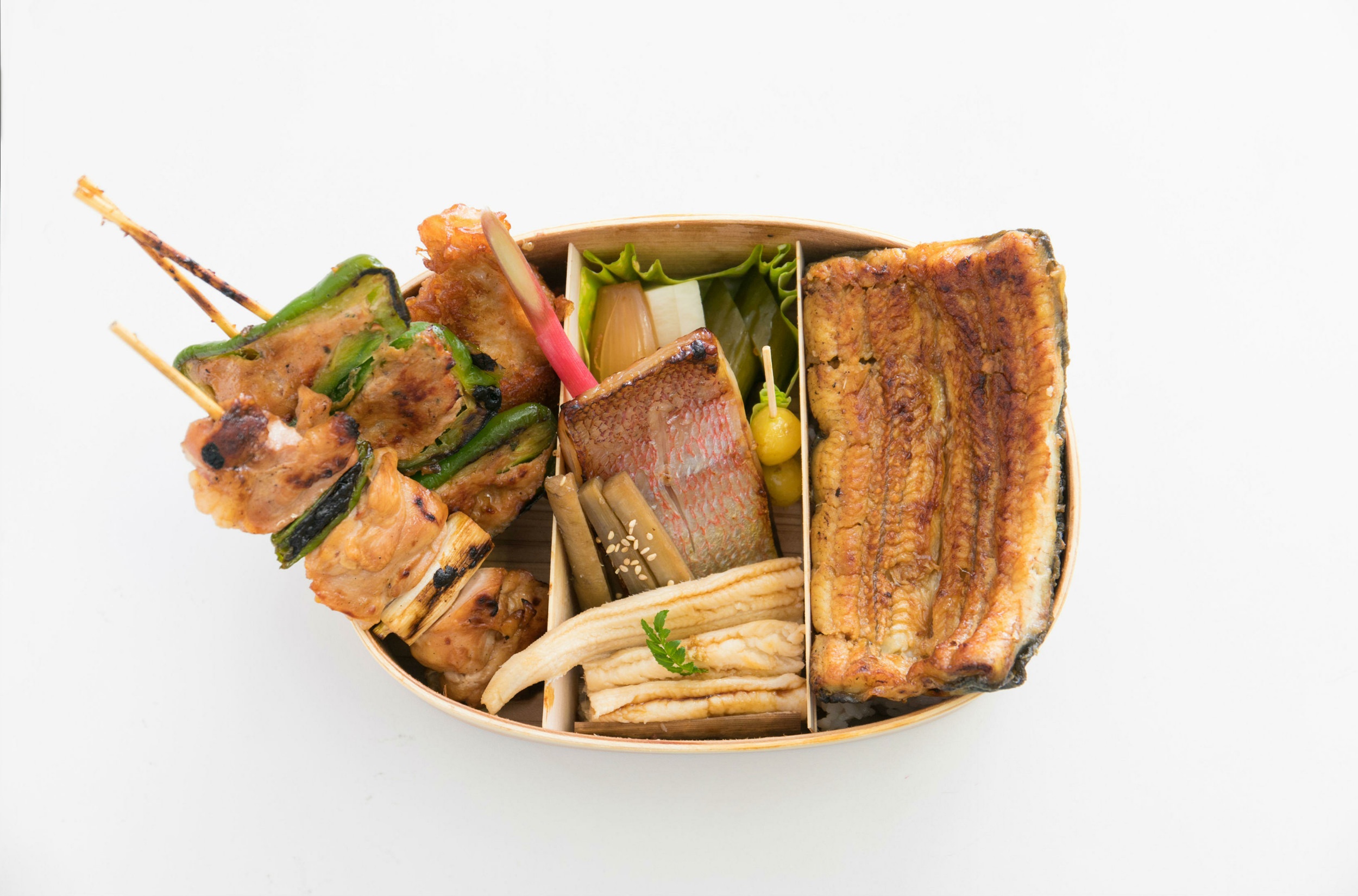 鹿児島産鰻(下にごはん)、甘鯛の西京漬け、山ごぼう、揚げ銀杏、らっきょ、おしんこ、はじかみ(生姜)焼き鳥、つみれ(ピーマンの肉詰め)、唐揚げ。